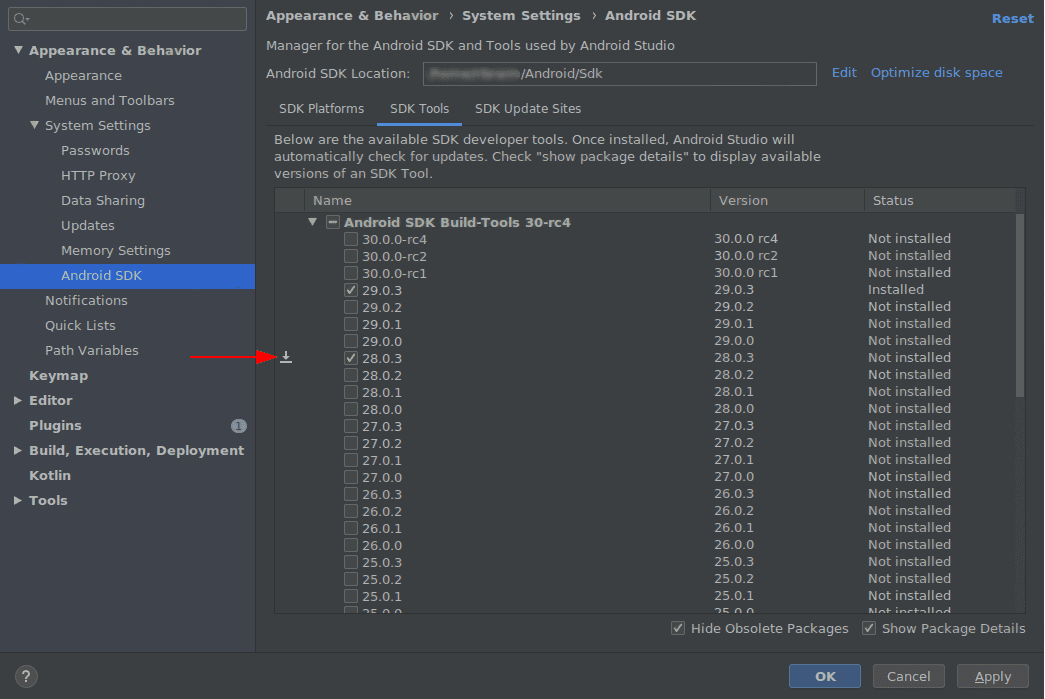 In the same screen, make sure to check the 28.0.3 on the "SDK Tools" tab, like that: