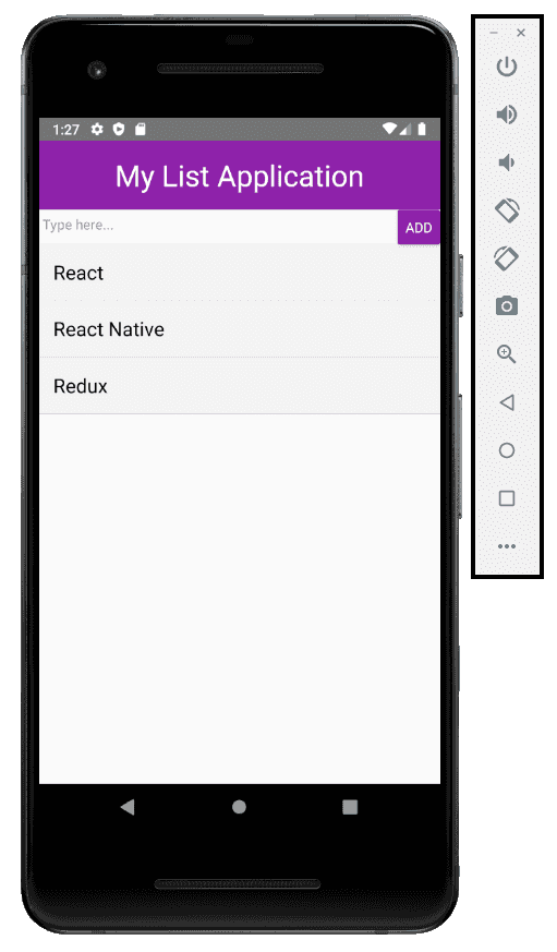 Finally, we put our Header, AddItem and ListItems inside a View component and pass the required props. After saving this file, the result in our emulator should look like that: