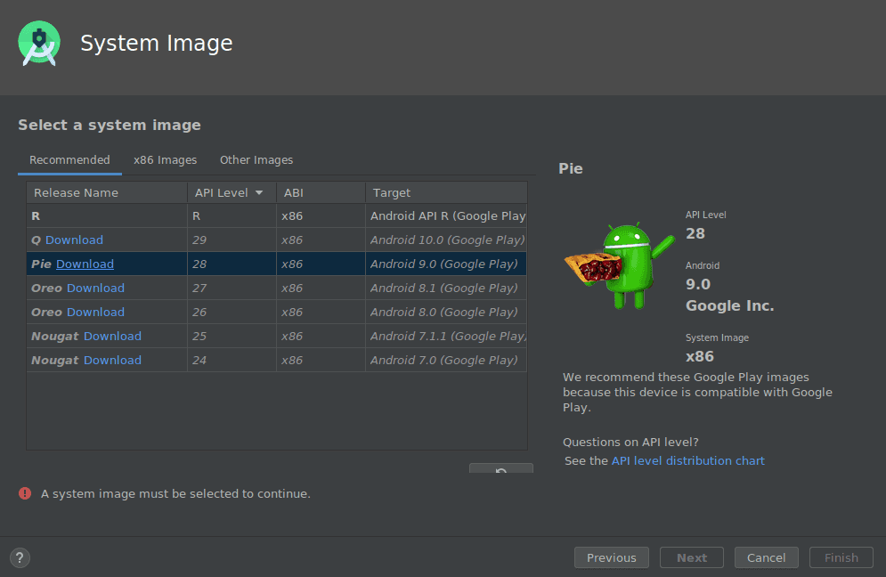 Click on OK and go make a coffee, because this one may take a while to download (1GB+). After that, back on the Welcome screen, choose the Configure > AVD Manager, and choose Create Virtual Device. On the next screen, choose a device of your liking (I will use the default Pixel 2) and click Next. This next screen is the System Image selection, and you must choose the Pie image, as shown below: