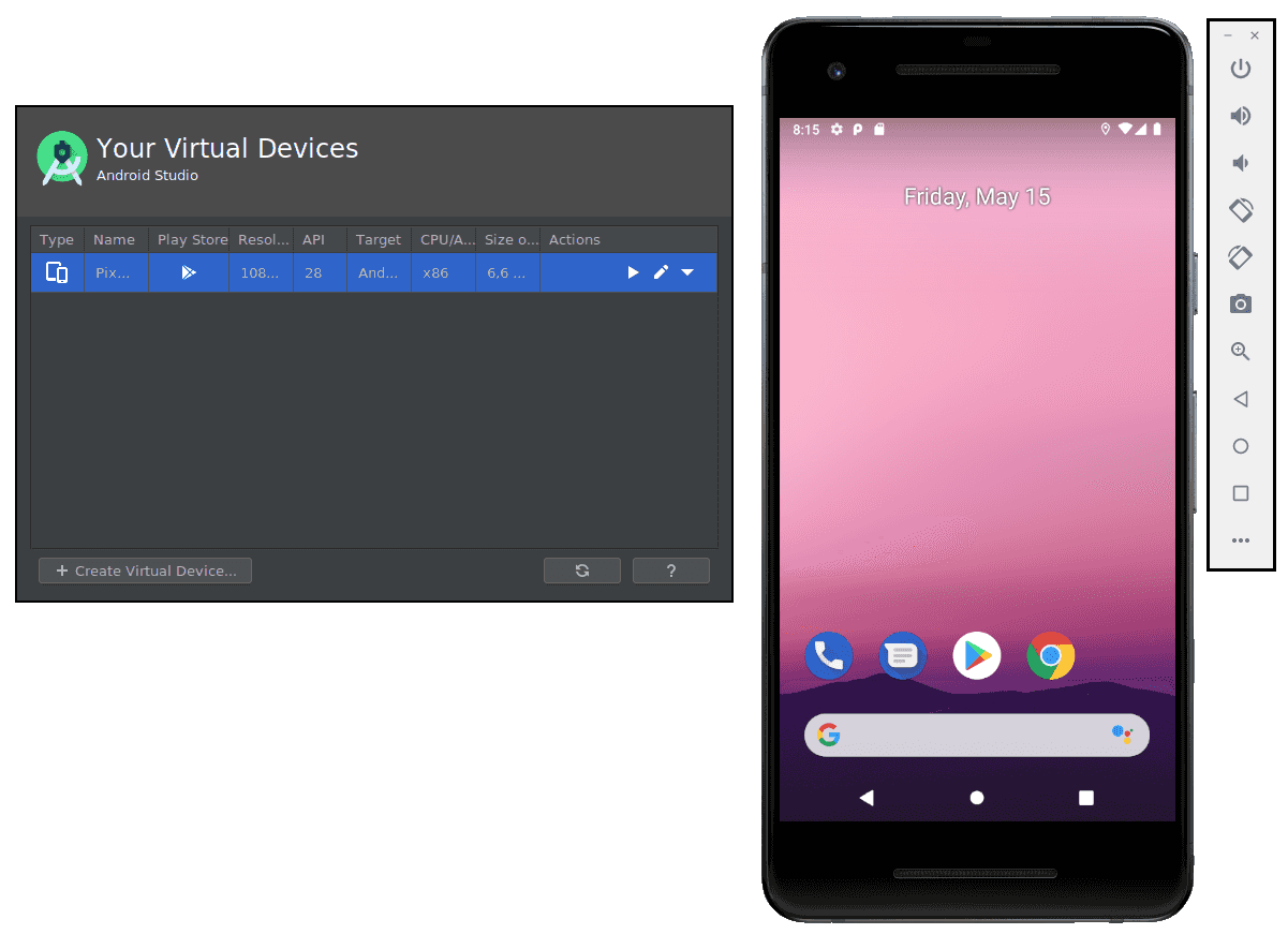 Note that if you don't have the image (like me, on the screenshot above), click on Download to get it and be able to proceed to the next step (again, this download will take a while...). After that, just continue with the process normally until you go back to the main AVD screen. From there, you can click on the Play button and, if everything is working, you will have a running android emulator available:
